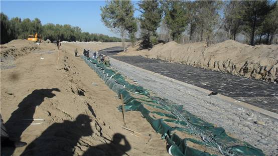 左堤加高:樁號ZD6+918~ZD9+235,填筑質(zhì)量標(biāo)準(zhǔn):粘性土壓實度≥92%,無粘性土相對密度≥0.65。填筑完成后進(jìn)行麻網(wǎng)椰纖植生毯鋪設(shè)。