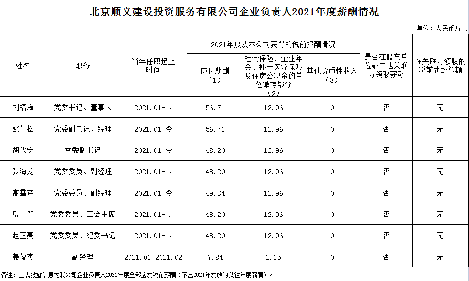 北京順義建設(shè)投資服務(wù)有限公司企業(yè)負(fù)責(zé)人2021年度薪酬信息披露