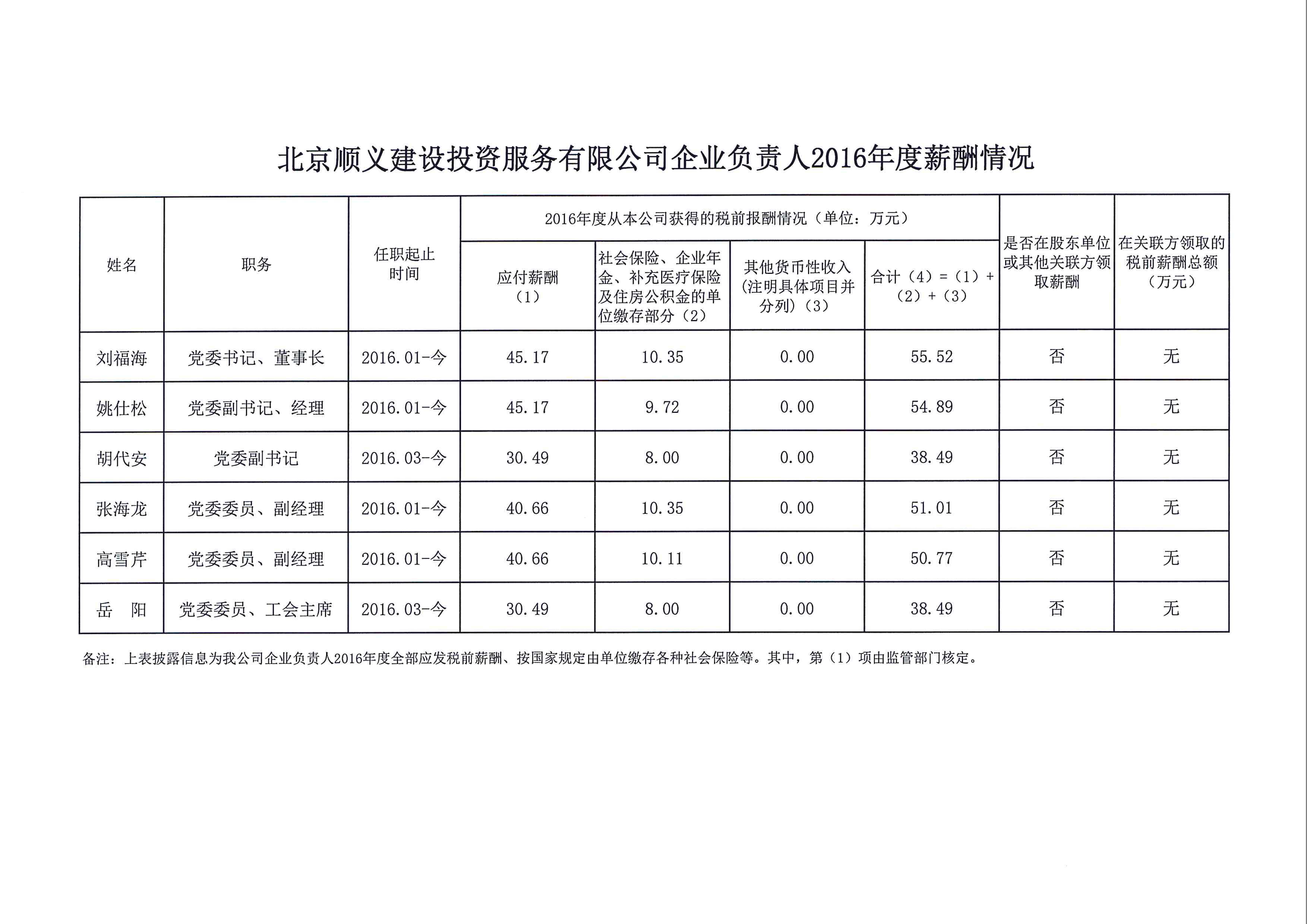 北京順義建設(shè)投資服務(wù)有限公司企業(yè)負(fù)責(zé)人2016年度薪酬信息披露