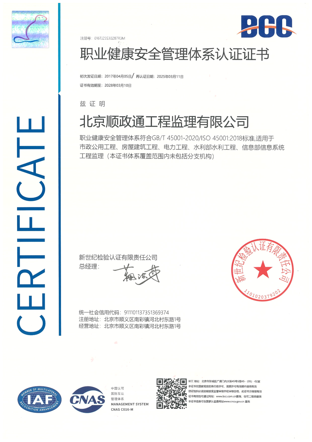 此次管理體系認證對順政通公司管理層、職能部室和在監(jiān)項目(溫榆河公園順義二期蓄滯洪區(qū)工程)進行審核,以及對市政公用工程、房屋建筑工程、電力工程、水利部水利工程及信息部信息系統(tǒng)的監(jiān)理資質(zhì)進行核查,重點包括:質(zhì)量管理體系(GB/T19001-2016 idt ISO9001:2015)、環(huán)境管理體系(GB/T24001-2016 idt ISO 14001:2015)和職業(yè)健康安全管理體系(GB/T 45001-2020 idt ISO 45001:2018)三大項。取得新版認證證書是對順政通公司管理體系運行的充分肯定和高度評價,為順政通公司從最新政策和專業(yè)視角進一步細化管理提出多項可行性方案,對順政通公司朝著“管理更規(guī)范、保護更全面”的方向進一步發(fā)展提供了思路,也為順政通公司承攬房建、市政、電力、水利、信息等多方面業(yè)務(wù)提供了強有力的支撐。